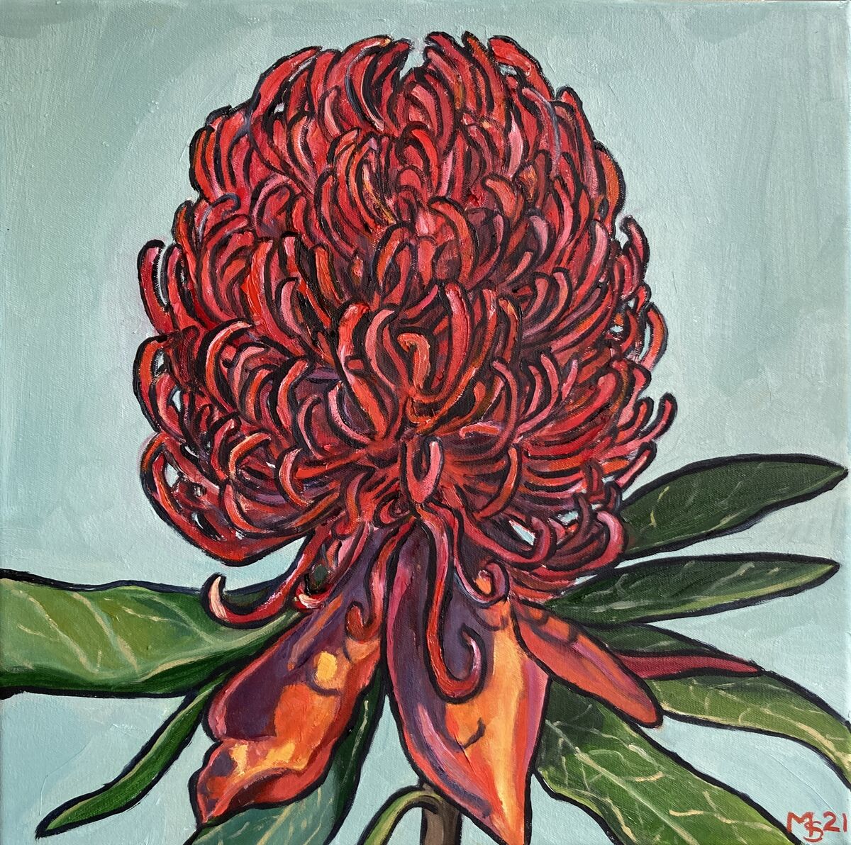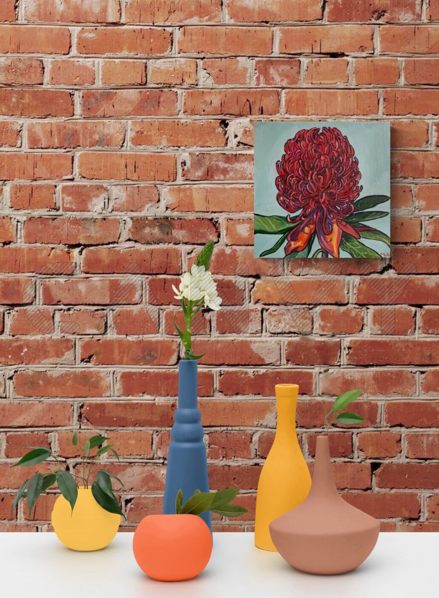 I think the Waratah is magnificent. A unique flower to Australia. Hard to spot in the native bush land, but when you do, it’s red flower is like a beacon, swaying in the spring breeze, standing tall above us all. Flowering for only a few weeks it’s like finding treasure when you do see one. Such an elusive flower deserves to be painted as many artists have done in the past. Here is my version. This would look great framed in a dark or natural box frame.