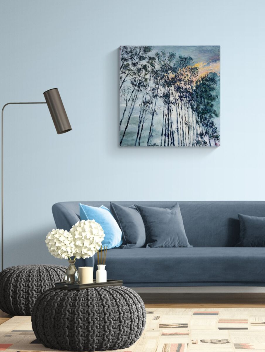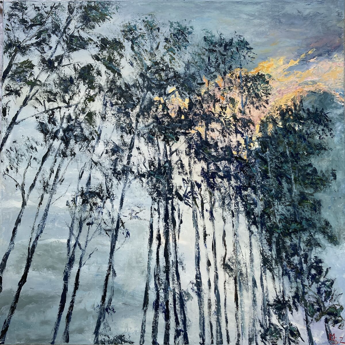 I was sitting under this tree canopy enjoying the calm following a Summer storm. The evening was approaching and there was a moment of absolute serenity. Mother Nature can still put on a magnificent display, ignorant to the troubles of her human occupants in these pandemic times. This tiny moment made me forget all the troubles of the world and find some peace. I have painted this to take me back to that time, and hopefully do the same for the observer. This is an oil painting using only palette knife, so has an impasto quality to it. It is quite large so would suit a feature wall.