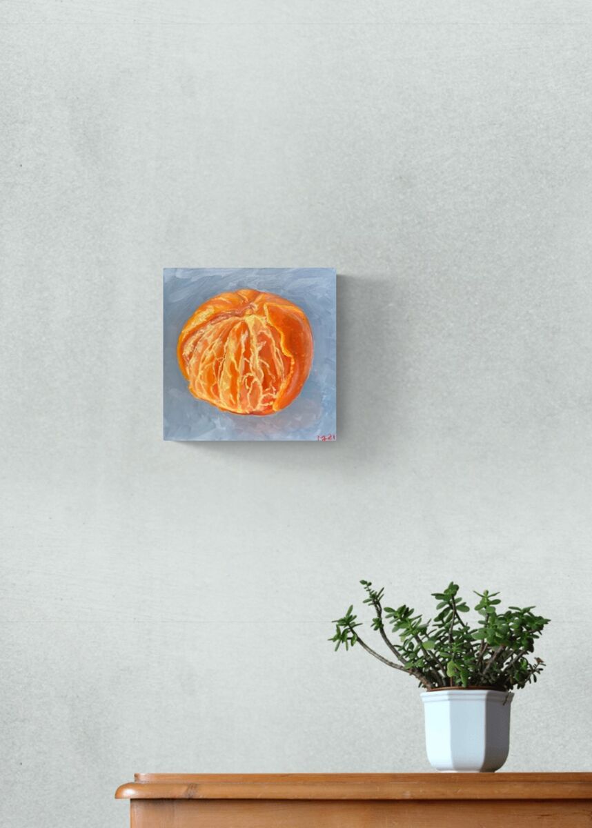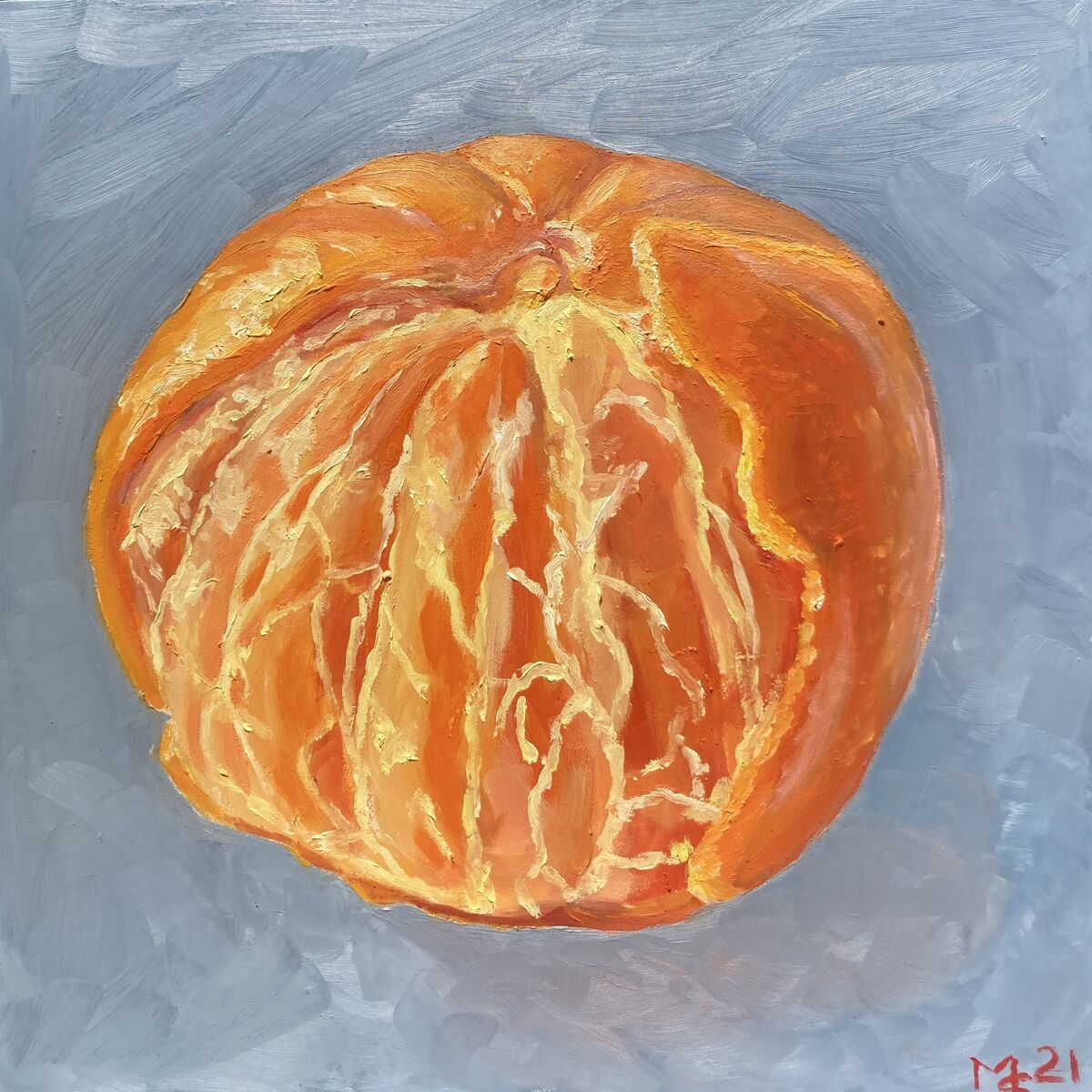 Here I have painted a partly peeled mandarin. The beautiful sweet scent diffuses through the air and evokes deliciousness, as does its orange colour. These are the things that inspire me to paint everyday things and I’m really enjoying painting minimalist still life on wood panel at the moment.