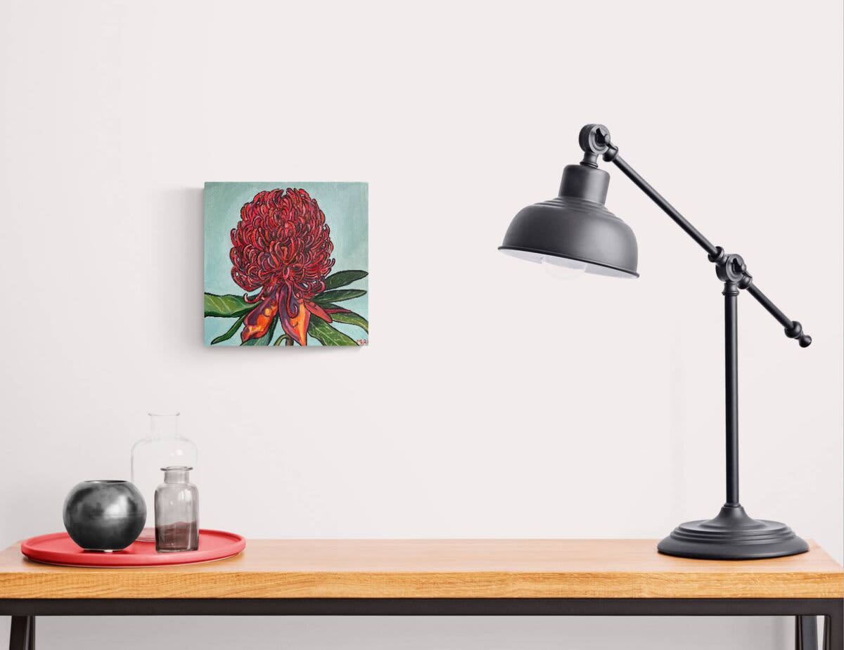 I think the Waratah is magnificent. A unique flower to Australia. Hard to spot in the native bush land, but when you do, it’s red flower is like a beacon, swaying in the spring breeze, standing tall above us all. Flowering for only a few weeks it’s like finding treasure when you do see one. Such an elusive flower deserves to be painted as many artists have done in the past. Here is my version. This would look great framed in a dark or natural box frame.