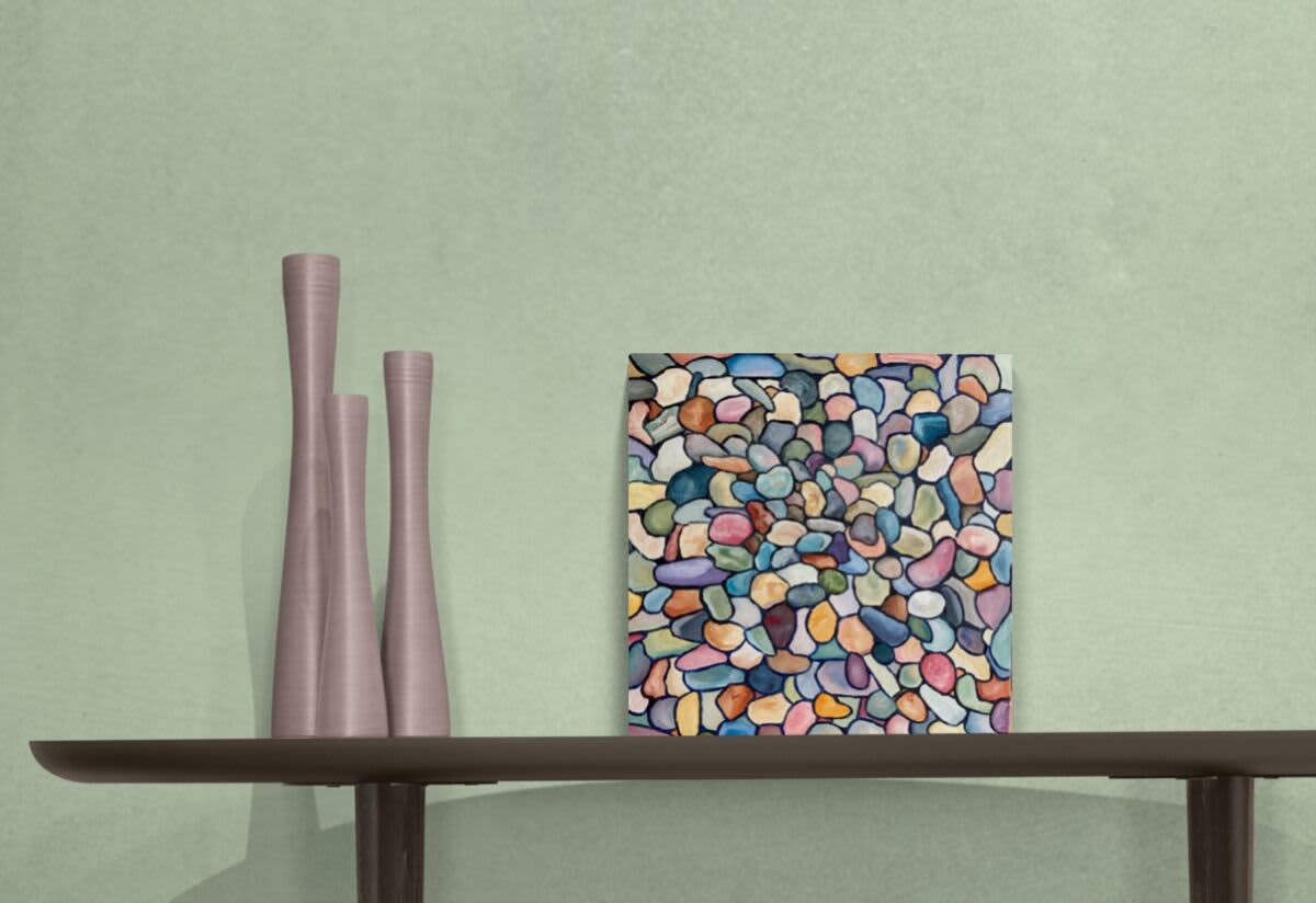 Hundreds of coloured pebbles washed up on the beach. Another opportunity to capture something unusual in oil paint. I’ve abstracted theses pebbles, hard to believe they came from the sandy beach floor. This painting can hang as is but would look great in an oak frame. As demonstrated in the second styled view.
