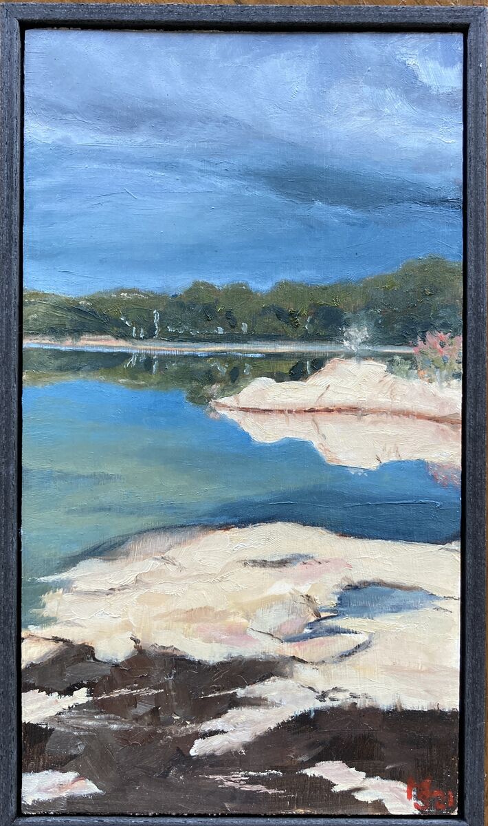 Following in the footsteps of the Australian impressionist, this landscape painting is on a wood panel sized the same as the cigar box lids they often used. I have selected a similar colour palette to depict this scene at Dunns Swamp in the Capertee Valley, country NSW. This is a place with a sad history where the Aboriginal people who lived and farmed the area were wiped out by settlers poisoning their drinking water with arsenic. Such a tragic episode in our history, probably unknown to many. This is a beautiful part of the world, but there is an eeriness here, a sense of the past, that is haunting and should not be forgotten. I have framed this panel in a thin grey oak box frame. It is small and could look good resting on a shelf or hanging on a wall space between windows or doors.