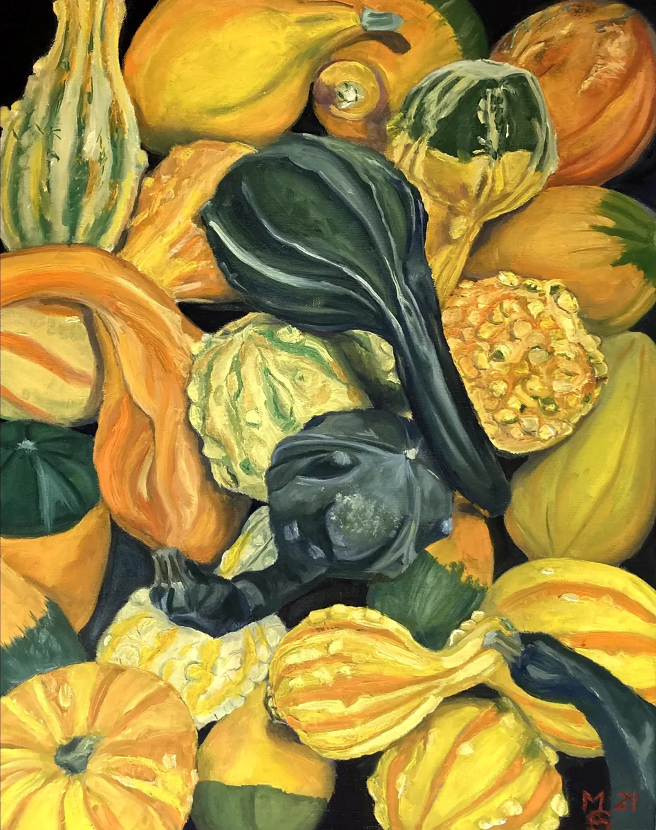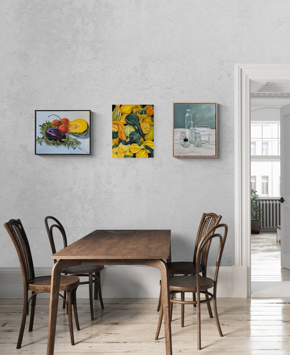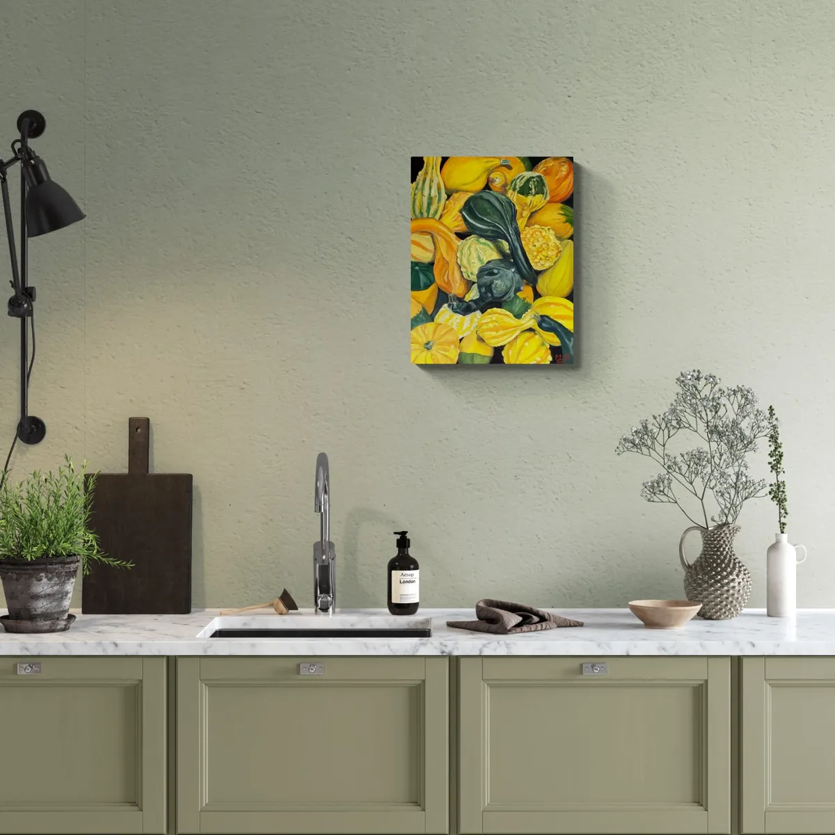 Oil on canvas, stretched and ready to hang. Signed on the front. I loved creating the weird and wonderful alien shapes of these gourds, pumpkins and zucchinis. I found these contorted vegetables in a market in Paris. I was just captured by the strangeness and vibrancy of them and I knew it was something I wanted to put down on canvas and the oil paint just wanted to move on it to help achieve the effect. It is pretty vibrant in colour so should bring some energy to any room.