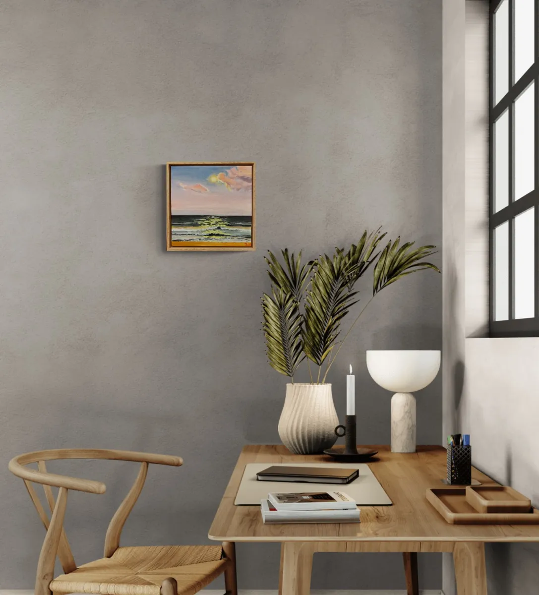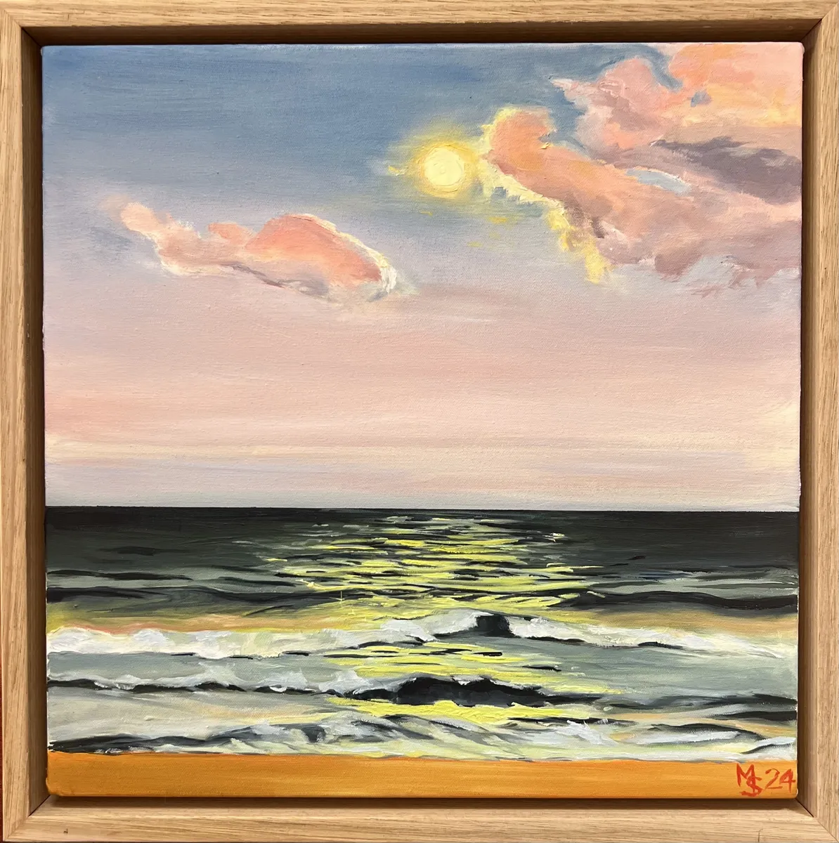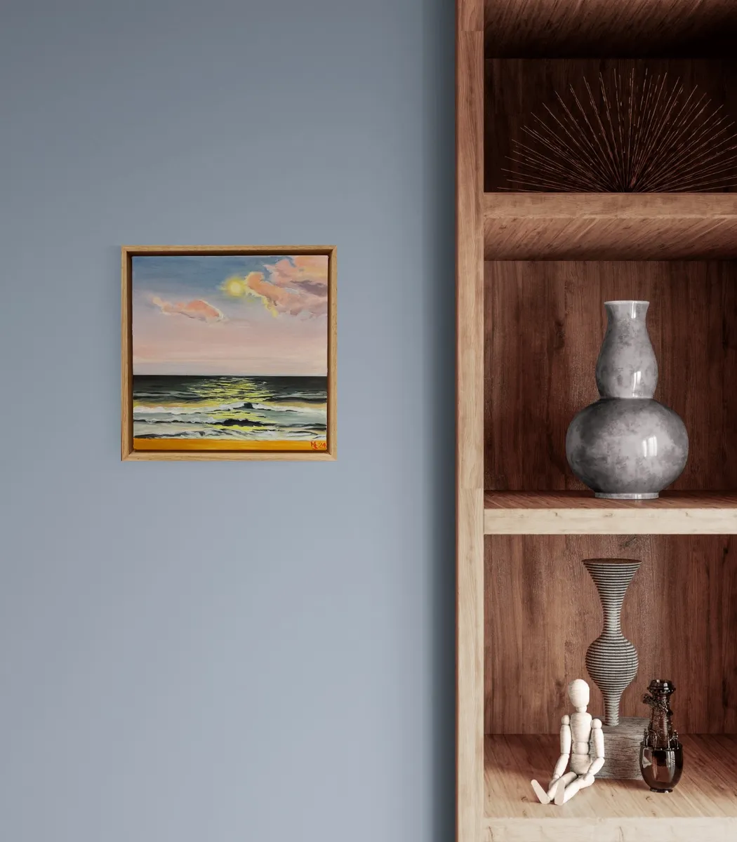 Poly Cotton smooth canvas Signed on the front. This artwork comes with an external frame The full moon rising in the Eastern sky produces a beautiful glow and an eeriness on the ocean. The light and colour draw me in and a painting comes to mind and helps to forget about the troubles of the world. Peace, quietude, beauty.