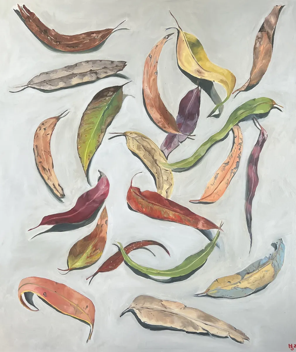 I am drawn to paint the organic nature of leaves falling from trees. The earthy colours are rich and the natural decaying of the leaves give the painting interest. I have painted leaves many times - each leaf has it's own uniqueness and the artwork becomes a study as I observe these qualities.