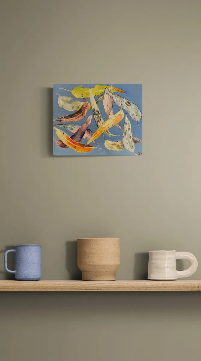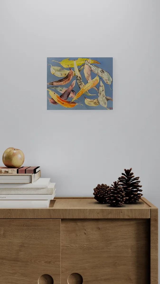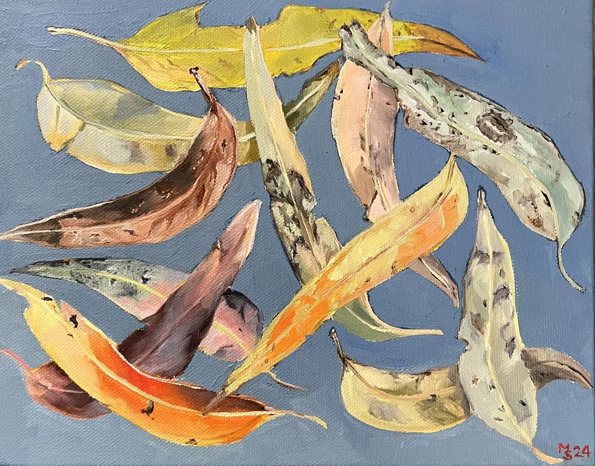 This is the subject I love to paint. Scattered decaying leaves on a plain background, this time a Wedgwood Blue colour. This is a small work ready to hang amongst other paintings or in a little niche space of a room. There are so many wonderful colours that these leaves, fallen from the tree, display as the perish into the soil.