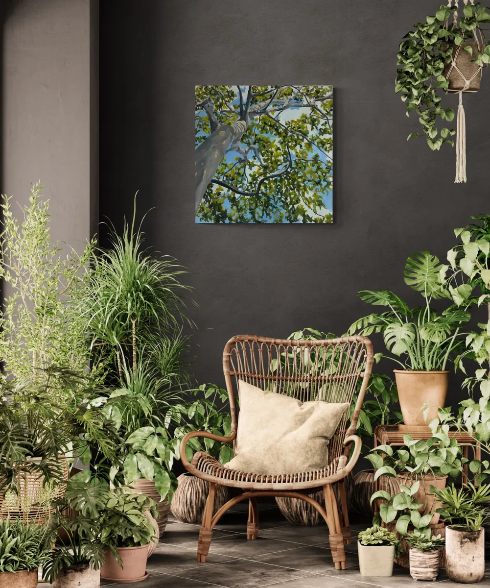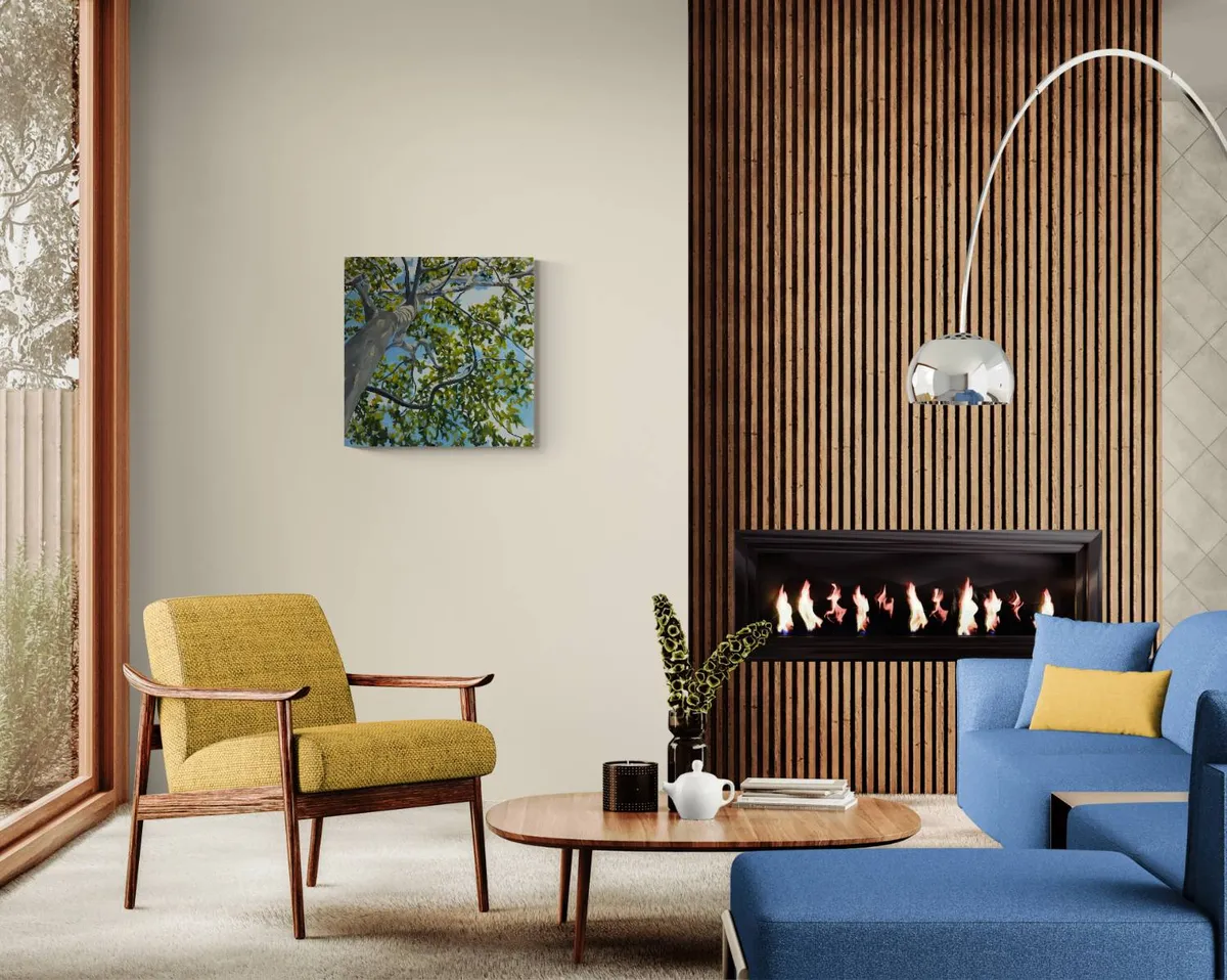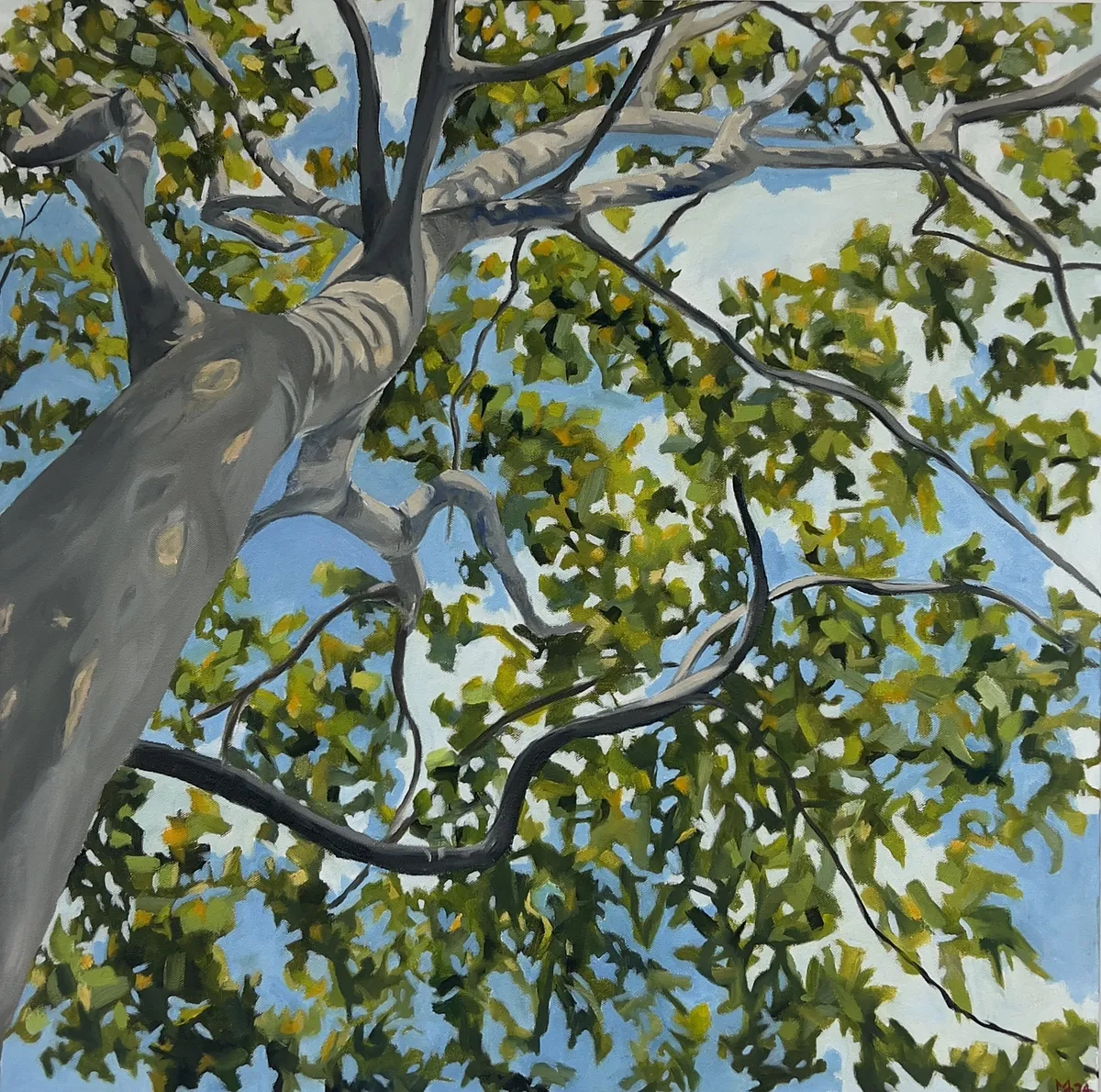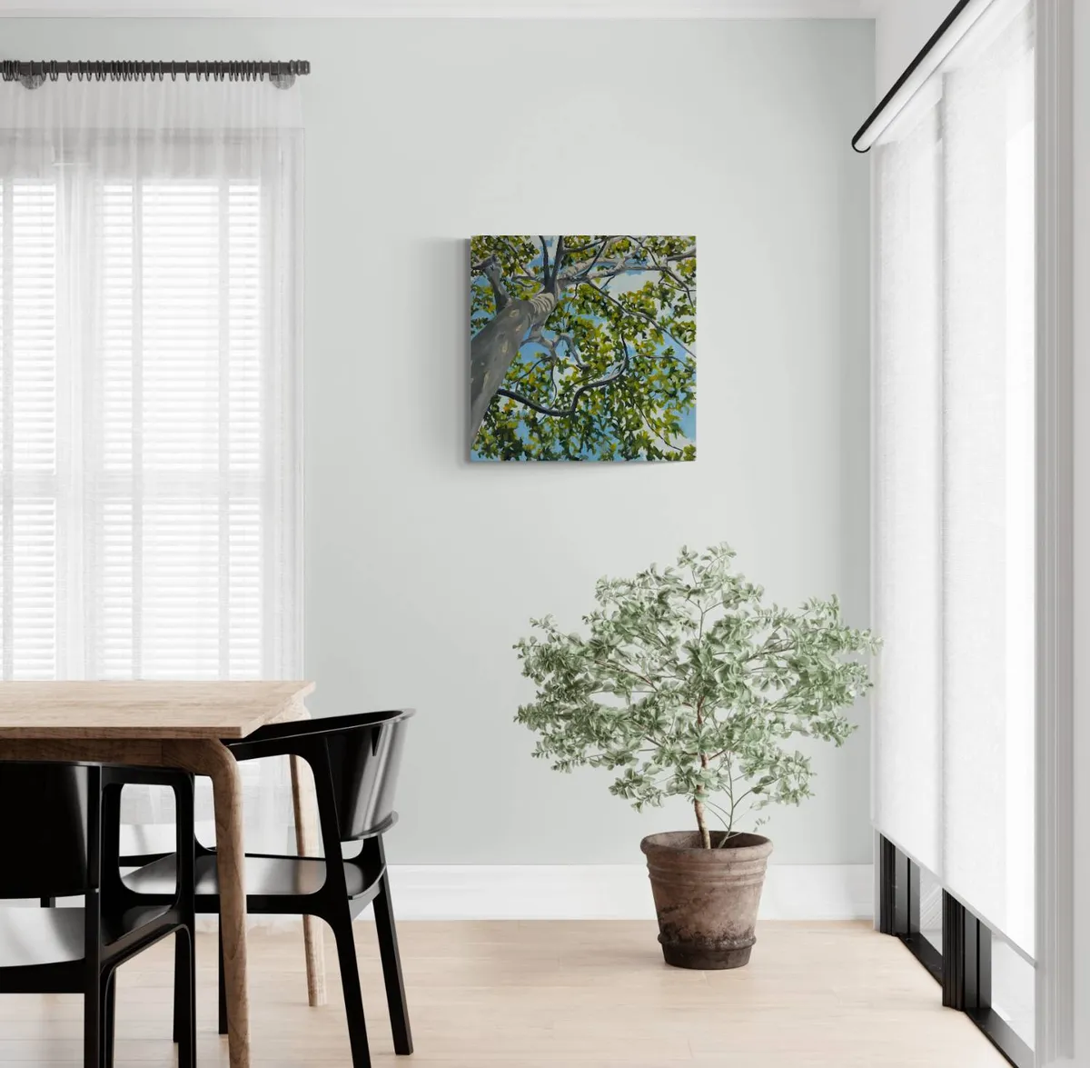 We live in complicated times. It is hard to keep up with the ever changing way of life and the accepting of the "new normal". There is more tension and anxiety among many of us. Sometimes we need to take a step back from the frenetic pace of living and look for an awe moment. Here, you can, with my painting. Looking up toward the sky throught the trees takes us away from the everyday, enables us to take a deep breath and forget the troubles of the world.
