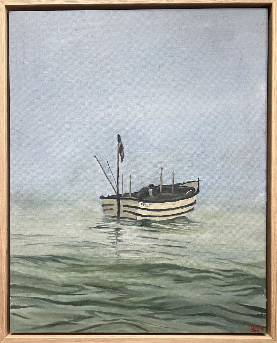 The fog and mist over the water were the inspiration for me to paint this. The boat appears from nowhere with a lone sailor sorting something on board. Perhaps he is admiring his catch for the morning, or a sorting a tangle of lines or nets. I’m hoping this scene provides some mystery and offers the chance for the observer to make their own story.