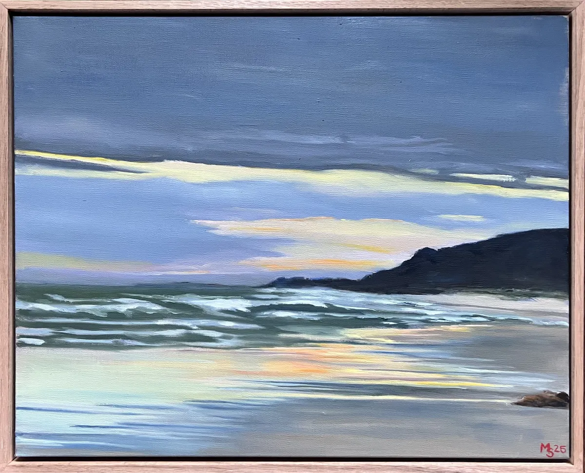 Treachery is a beach on the mid North Coast in NSW. The name is apt, most often an unruly surf beach but with that, you see and ever changing scene and a fixation on what will come next. This particular evening brought a beautiful sunset after some rain. Lots of mood and colour to inspire my work.