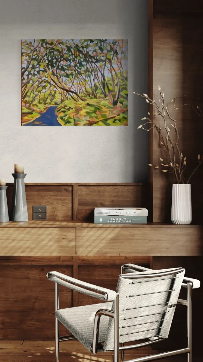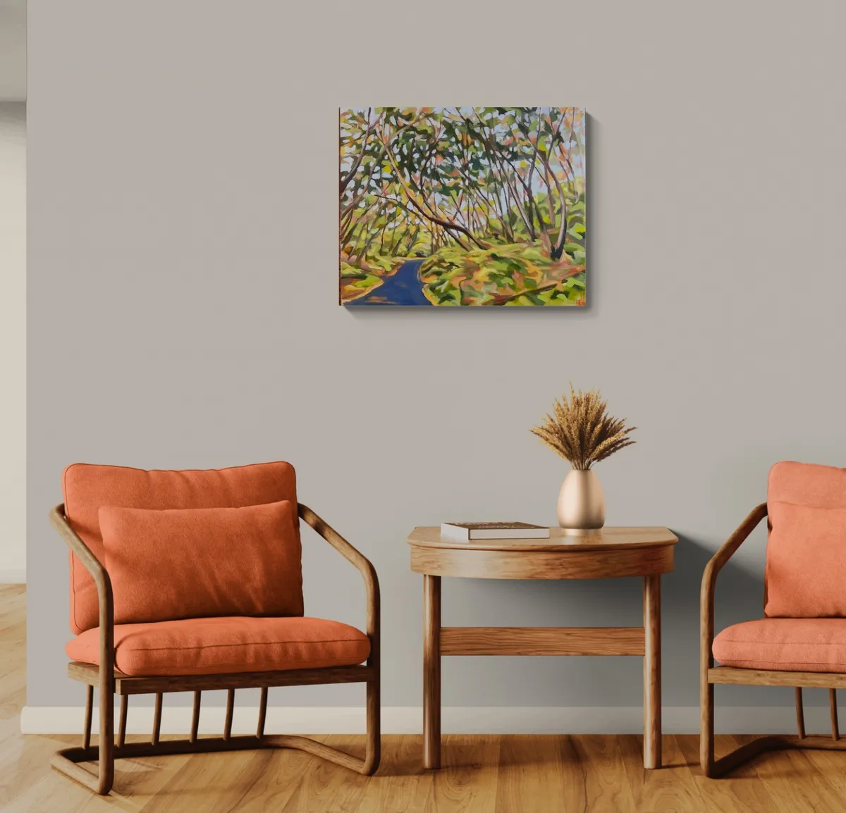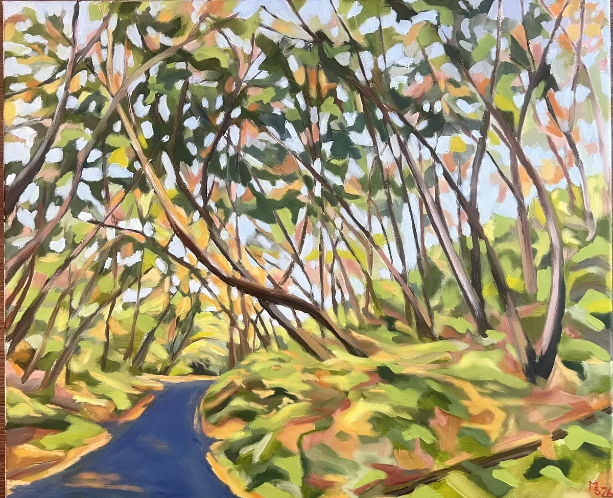 I was captured by the tree canopy across this path. The trail was darkened by the tree covering but little bits of light speckled through the leaves. A slightly abstracted scene with a path leading the viewer to an unknown endpoint.