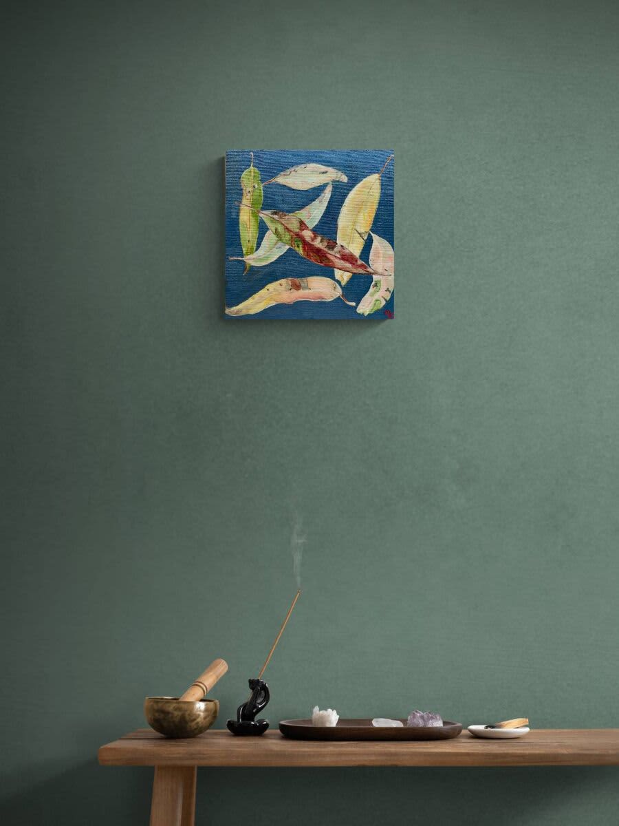 This painting of leaves is the 4th in a recent series. They have fallen from trees onto our urban streets and paths, walked on by the passerby . The leaves are decaying, but when that happens they take on such interesting colour and form. My eye finds the beauty in this and I want to paint them. This is a small painting, 30cms square. The colours are earthy and warming, perfect for an entrance or hallway, or a little corner nook.