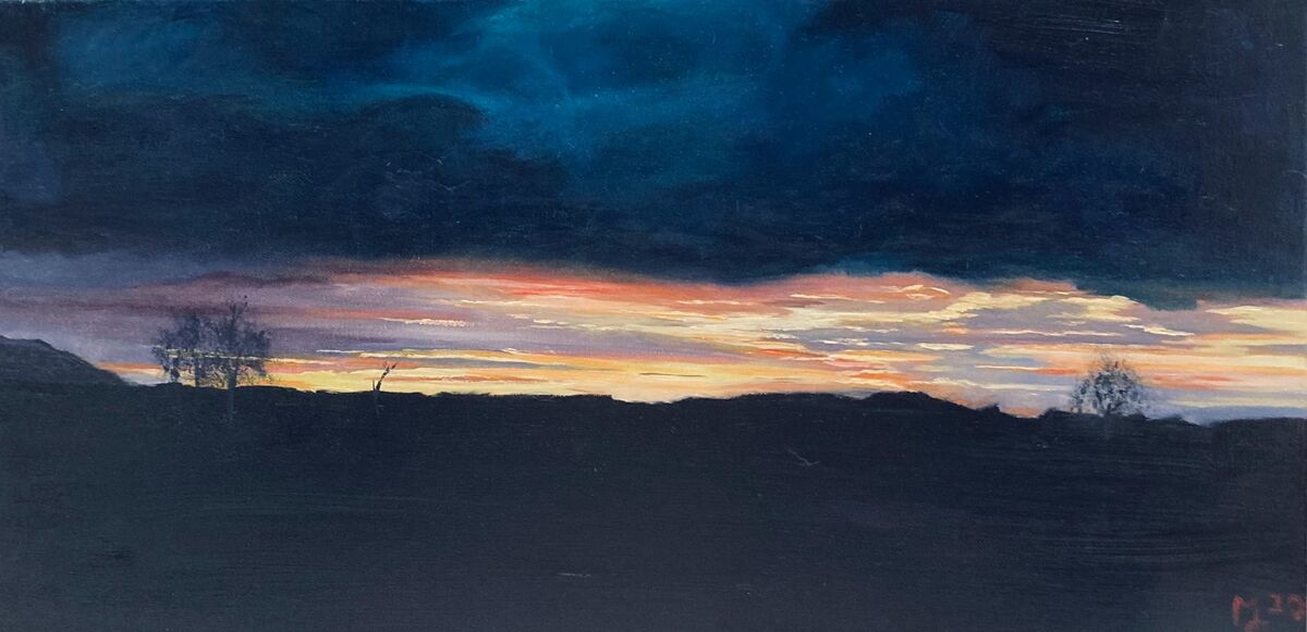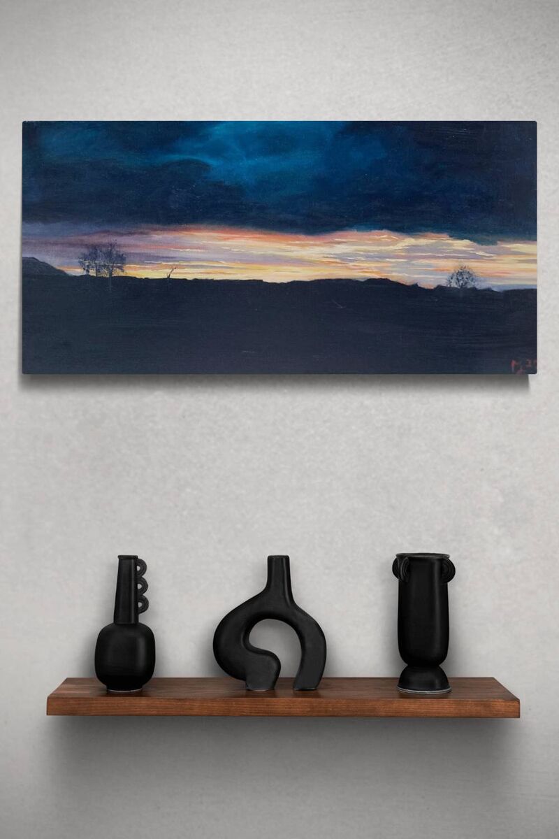 While travelling through NSW this Covid year I discovered how beautiful our own backyard is. We were staying on a farm just outside Orange in NSW. This sky appeared just as the sun was setting. It was extraordinary with the colours so strong it was almost unreal. But it was real!! Spectacular skies throughout this amazing country we call home, and I just had to capture them in paint on canvas. The canvas size gives the painting a panoramic perspective and would hang well in a corner space or above a piece of furniture. A little moody.