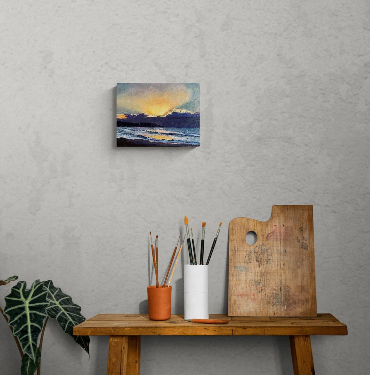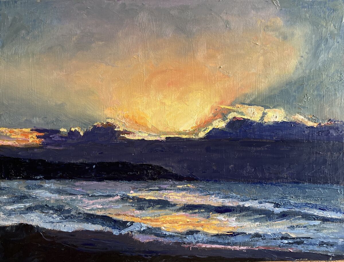 This was a beautiful winter sunrise at Tura Beach on the south coast of NSW. Such golden light appearing over stormy clouds. A cold day ahead! A wow moment lasting only a couple minutes but now held here in time with oil paint. I used a palette knife to paint this work. A small work on wood panel.