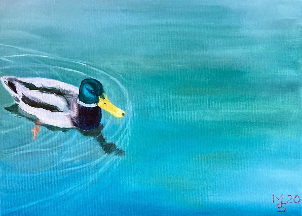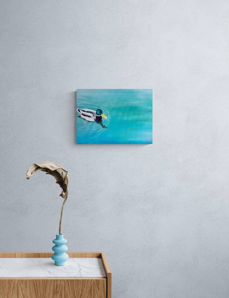 Le Canard sur L’étang is French for The Duck on the Pond. This little bird was swimming on the pond in the Luxembourg Gardens in Paris where I visited last year. The gardens are the place where Parisian families come to relax and enjoy their beautiful city. The pond is a draw card for visitors to sail model sailboats amongst the ducks and other bird life. This pretty duck caught my eye with its teal feathers and yellow bill. It was one of my favourite places in Paris and so I wanted to capture this in a zoomed in version of the duck on the pond. This is a small but bright oil painting that would lift a room with its colour.