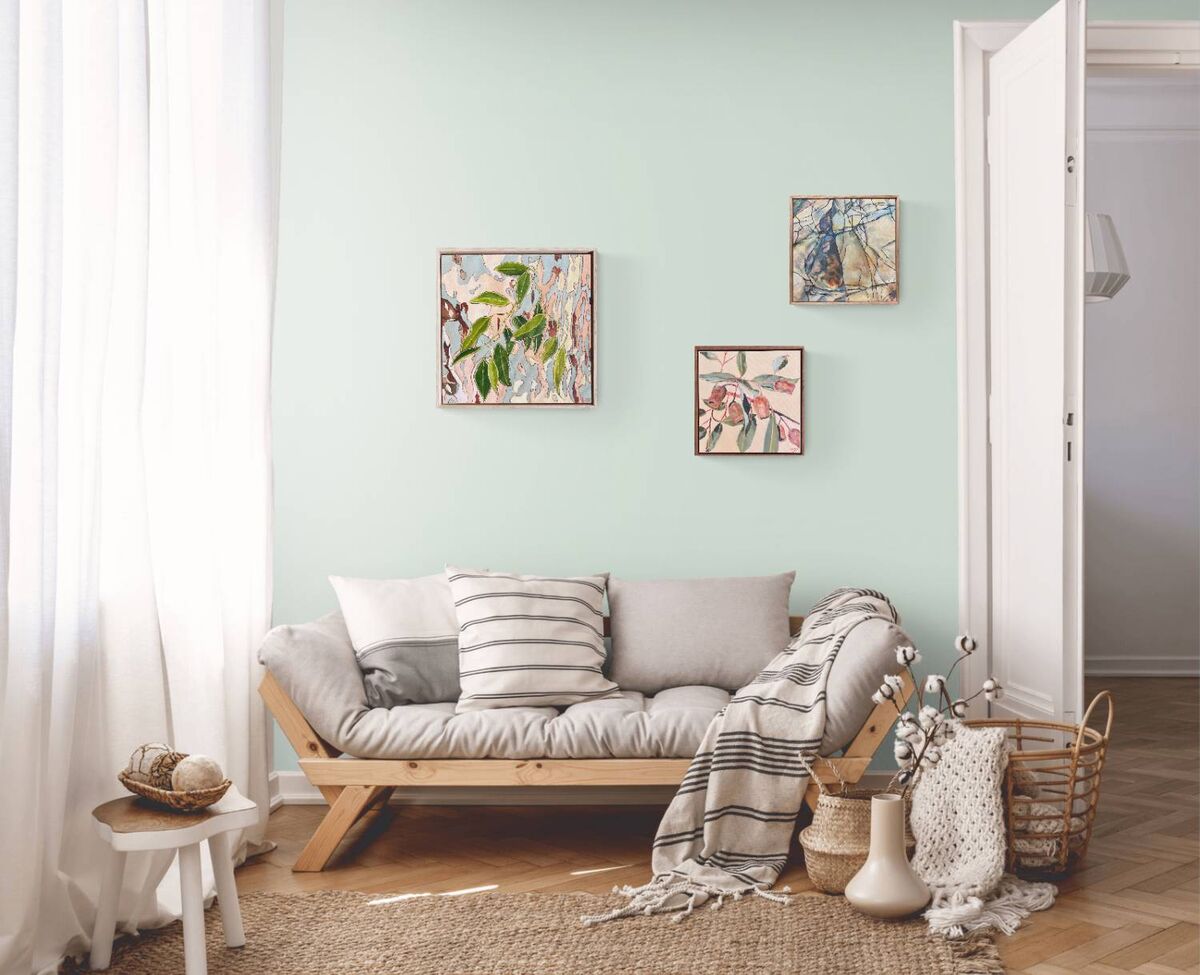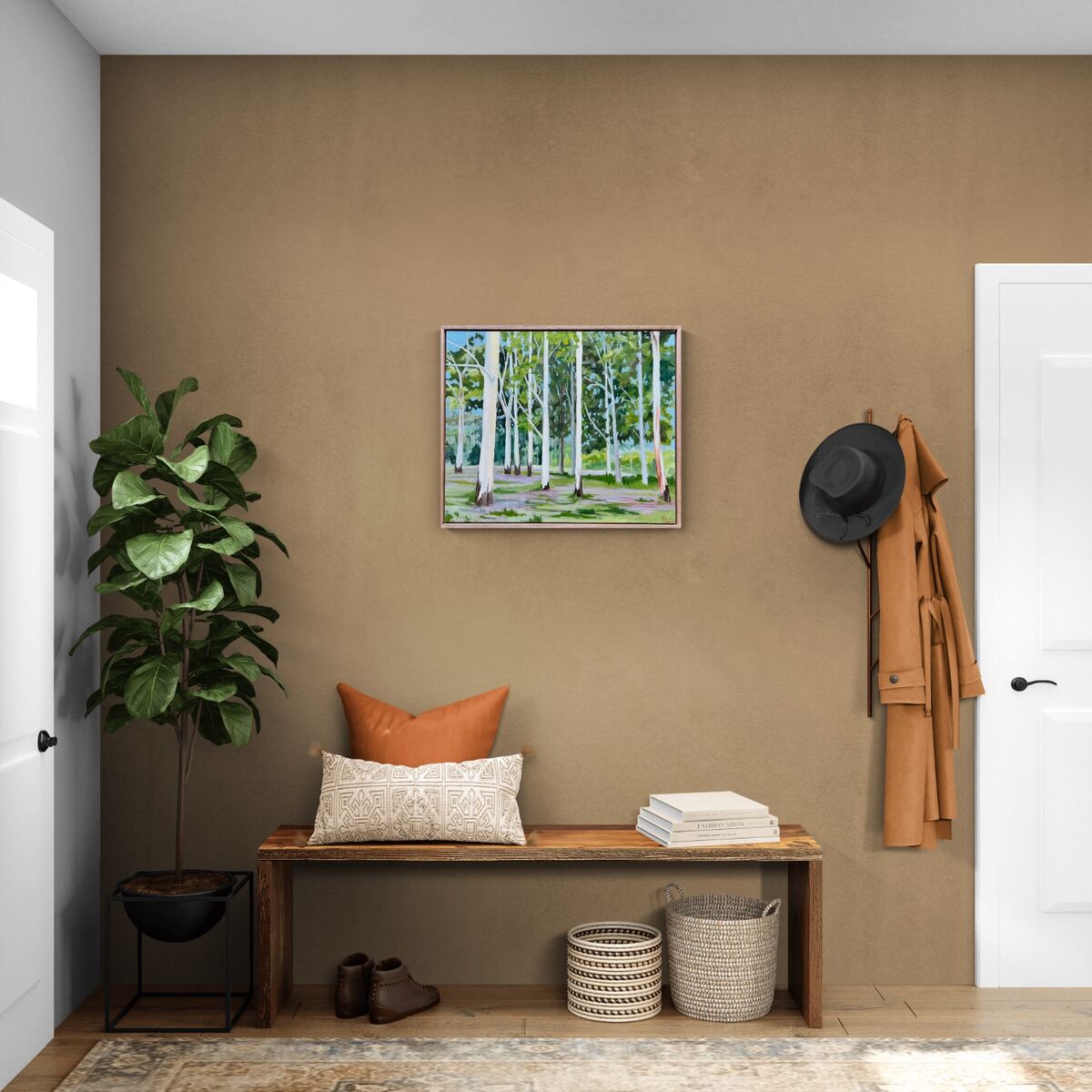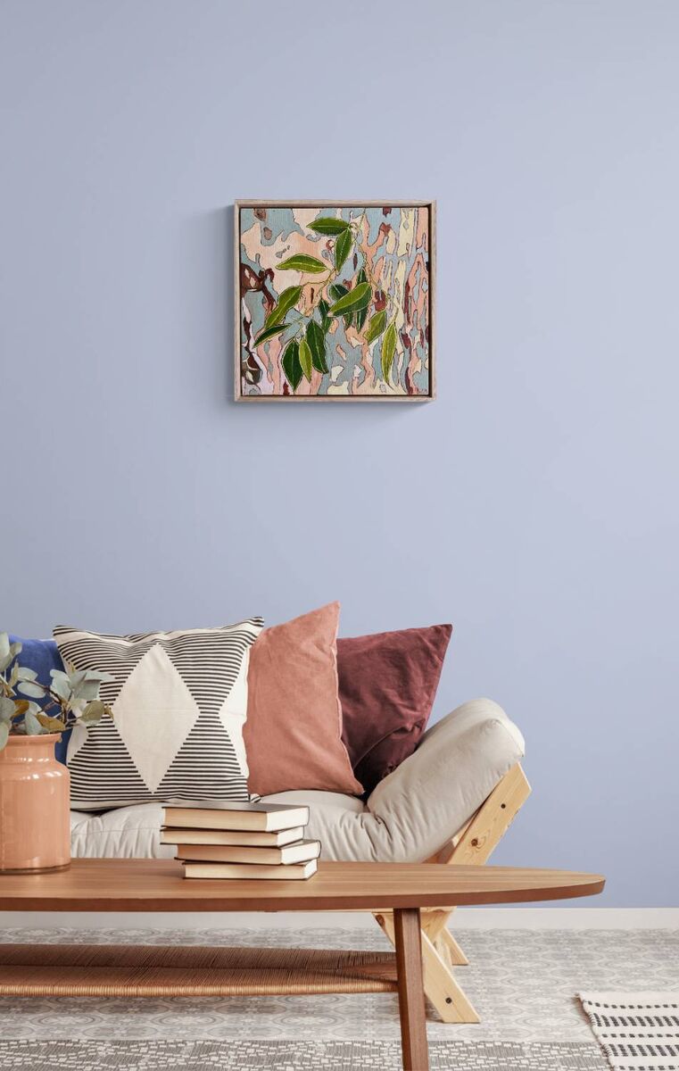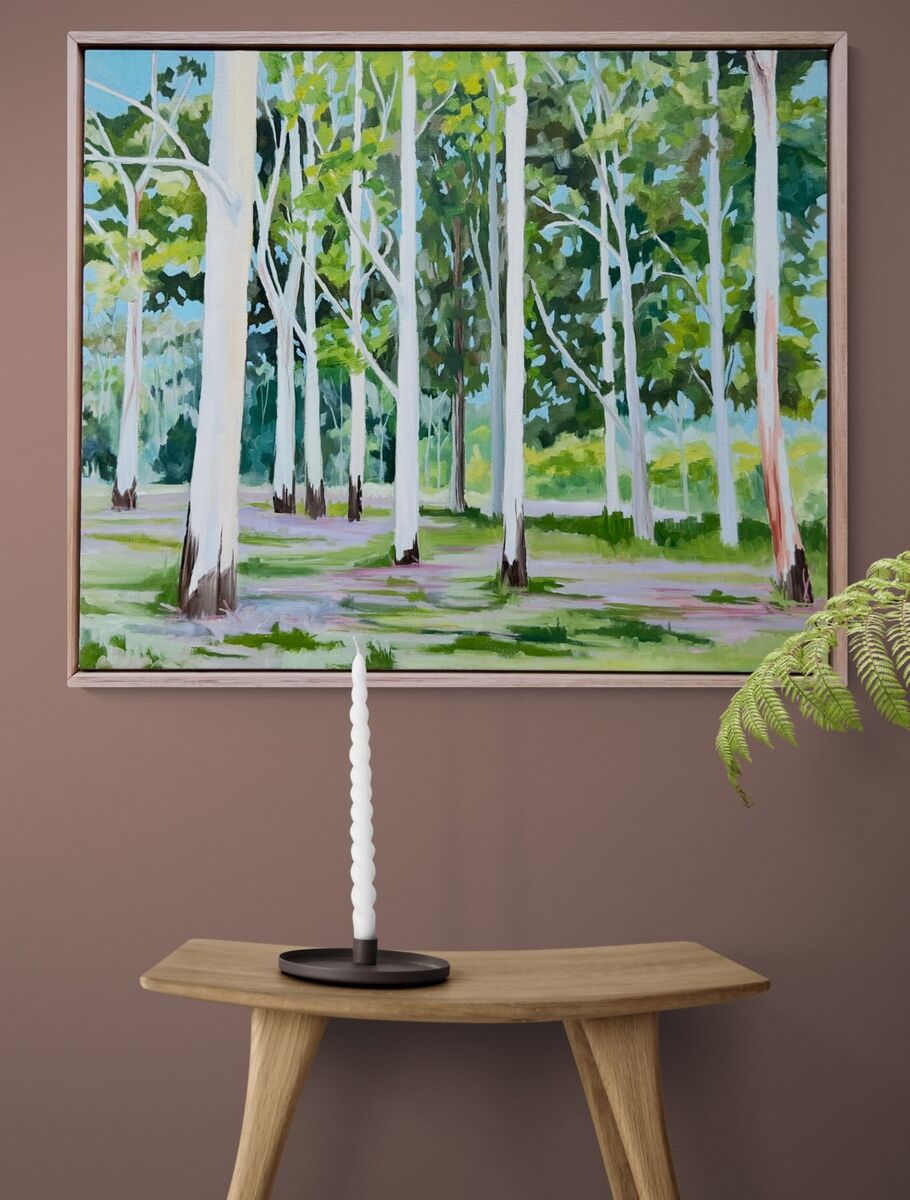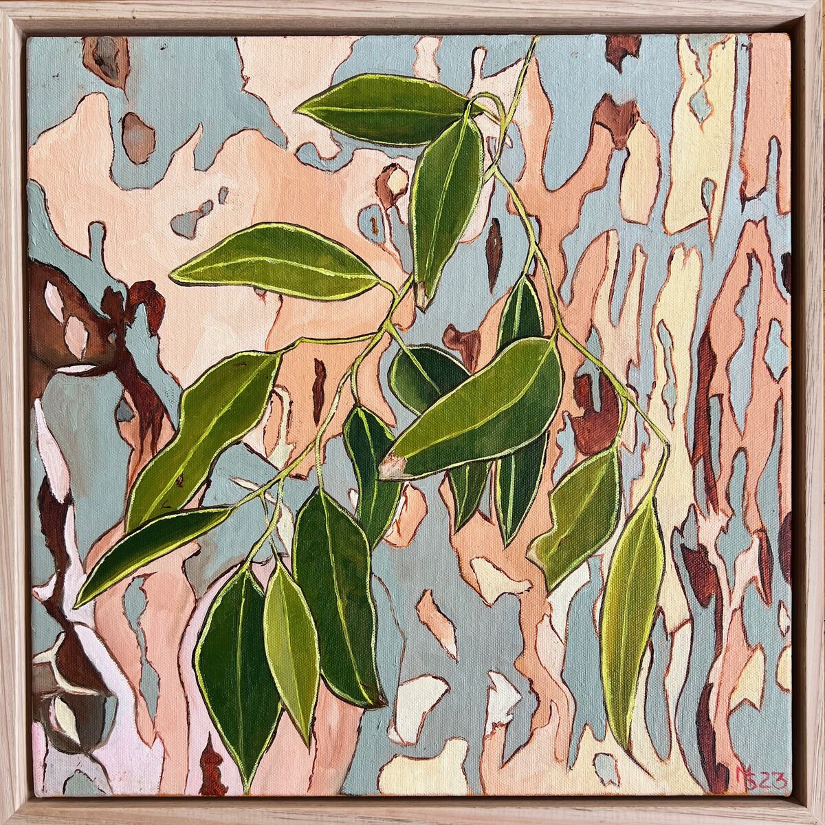 Oil on canvas, stretched and ready to hang. Signed on the front. This artwork comes with an external frame An afternoon walk in the nearby bushland led me through an arcade of magnificent Angophora trees where the bark was stripping away, revealing salmon colours beneath and the soft leaves swaying in the breeze. As my inspiration is to depict a moment in time with my artwork, this was definitely one I wanted to represent. I just love the colours that nature gives us. I smile when I paint subjects like these. I have abstracted the work somewhat to exaggerate the shapes and shades of the stripping bark. This is framed in a Victorian Ash box frame. Ready to hang in any room.