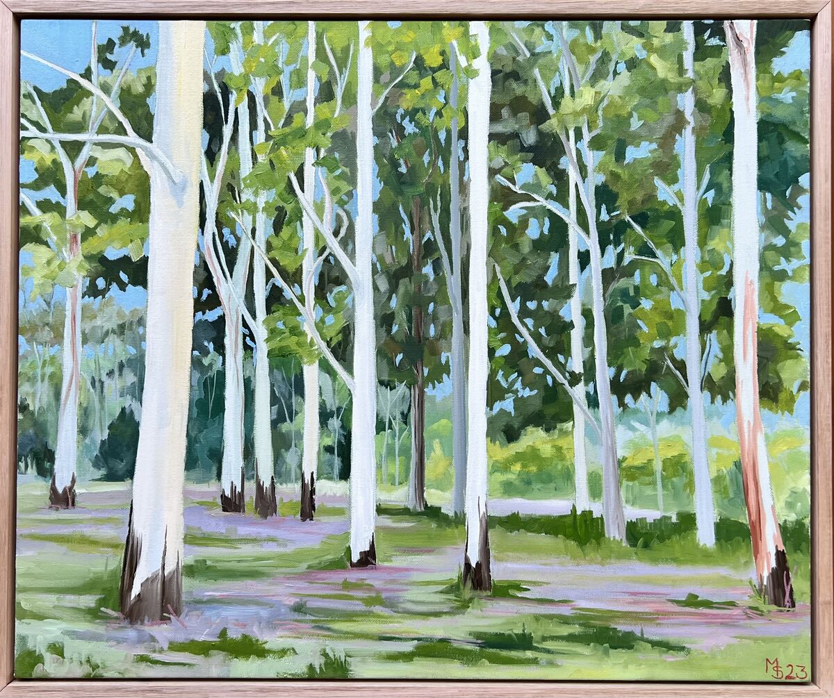 Again I have painted trees because they are magnificent and I love how nature displays her beauty while we can see the cycle of life continue around us. These Angophoras have stripped their bark to reveal ghostly white trunk’s standing out against the surrounding green foliage. The ghostlike trees appear to be gathering in a group waiting to frighten the unsuspecting visitor to the forest.