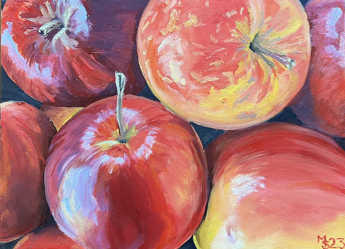 Red apples, crisp and crunchy and gorgeous to paint. The colour and variation of it are the inspiration for this work, nothing more! Take a bite.