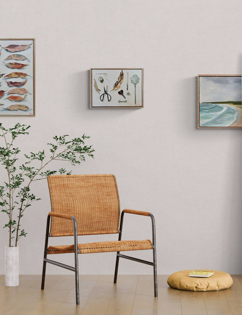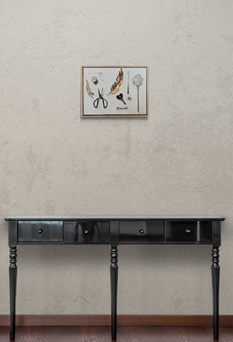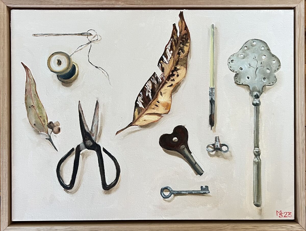 Here's a collection of bits and pieces I have collected over time. I chose these as subjects for this still life because they are curiously interesting and I love their rustic tones. Here I have included decaying leaves which I am drawn to, and wanted to incorporate them in this work. Beautifully framed in raw Australian blackwood, this painting would hang well in an entranceway or corner nook, office space or anywhere really. Although the background is light in colour there is warmth in its hues and would give a cosy space some ambience.