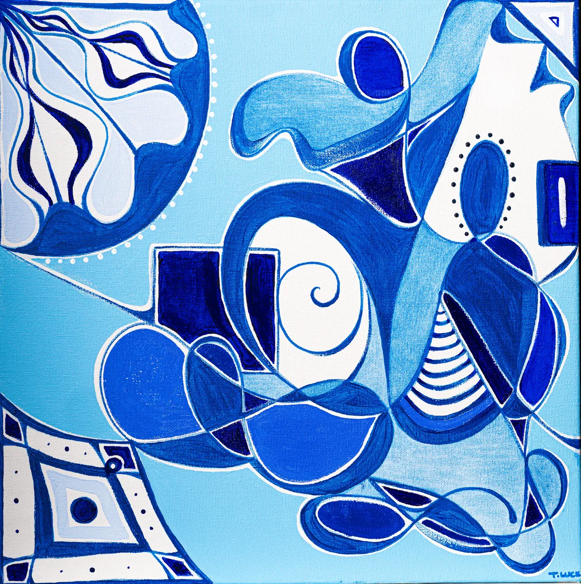 Resembles is a vivid, contemplative composition that merges structured abstraction with flowing spontaneity. Dominated by shades of cobalt, ultramarine, and sapphire, the work invites viewers into a layered architectural dreamscape—one where organic curves dance alongside angular fragments and cascading strokes. The title suggests a quiet inquiry: what does this evoke? What does it resemble to you? In this ambiguity, the painting becomes a mirror for the imagination—hinting at urban frameworks, watery reflections, or the fragmented beauty of memory. The interplay of light and dark tones creates rhythm and depth, while vibrant accents of white, green, and yellow punctuate the canvas like flickers of thought or emotion. A masterful balance of movement and stillness, Resembles embodies the notion that abstraction need not obscure meaning, but rather expand it—offering space for connection, curiosity, and personal resonance.