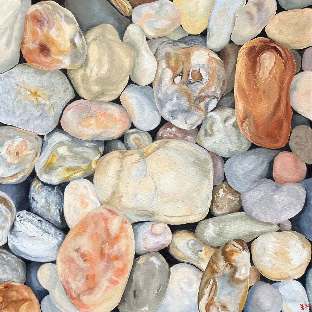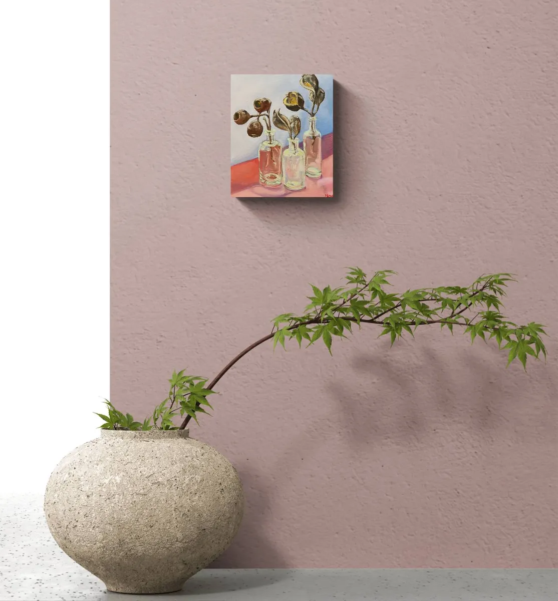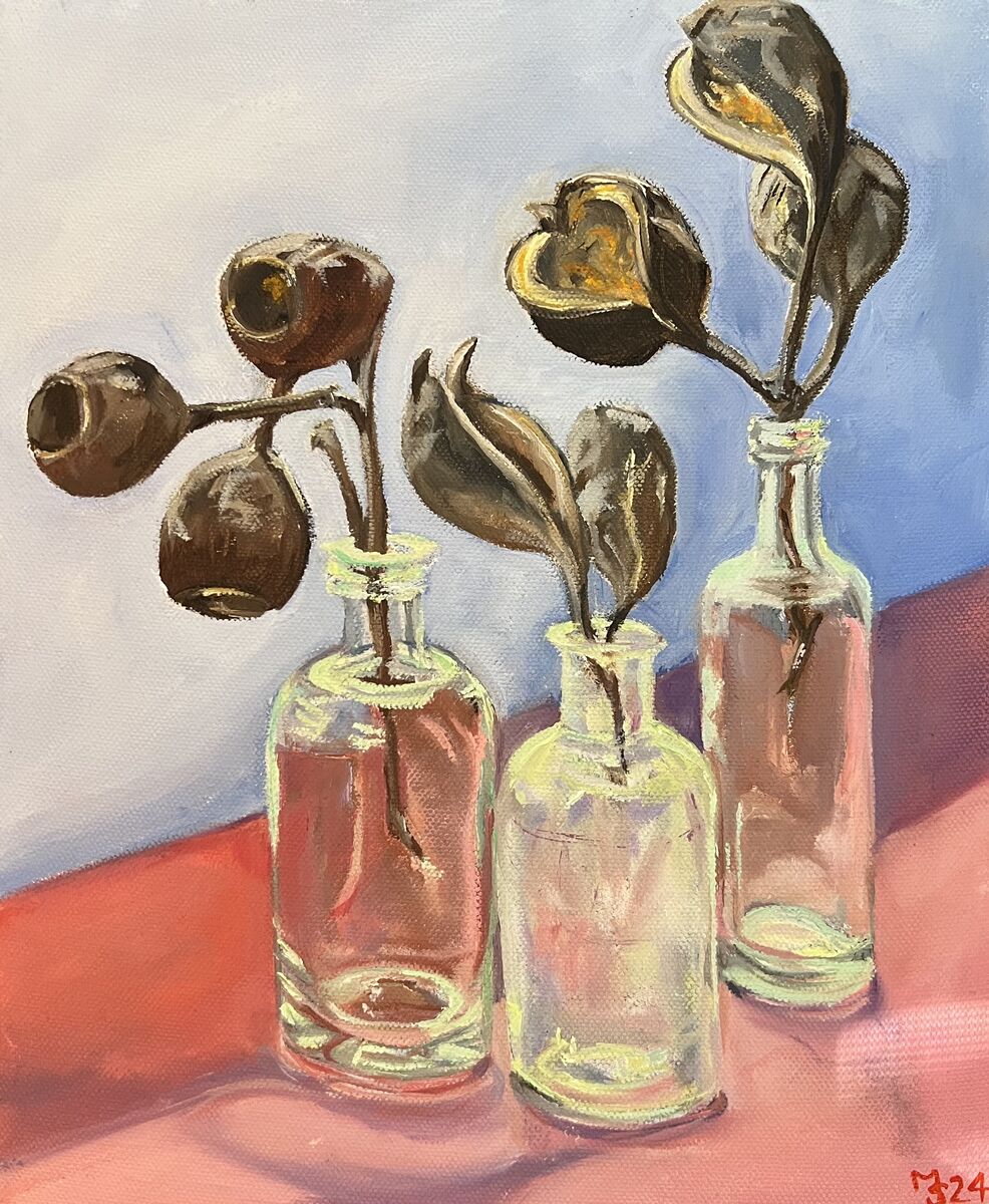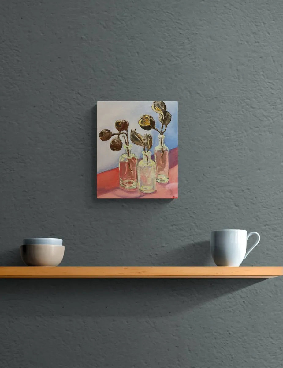 I revisit glass bottles and seed pods here, to show the effects of light on glass. The colours are irridescent and the shadows play with the distortion of the subjects. A bright little still life to cheer up a corner of a room or a corridor.