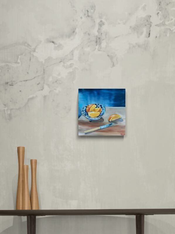 I have this beautiful blue and white Japanese ceramic bowl that I have been wanting to paint. I have also been wanting to paint an orange. How perfect to paint them together as they are have a colour partnership crying out to be put together. Orange and blue - complimentary colours. Delicious! How could an orange be called anything else but an orange. On stretched linen.