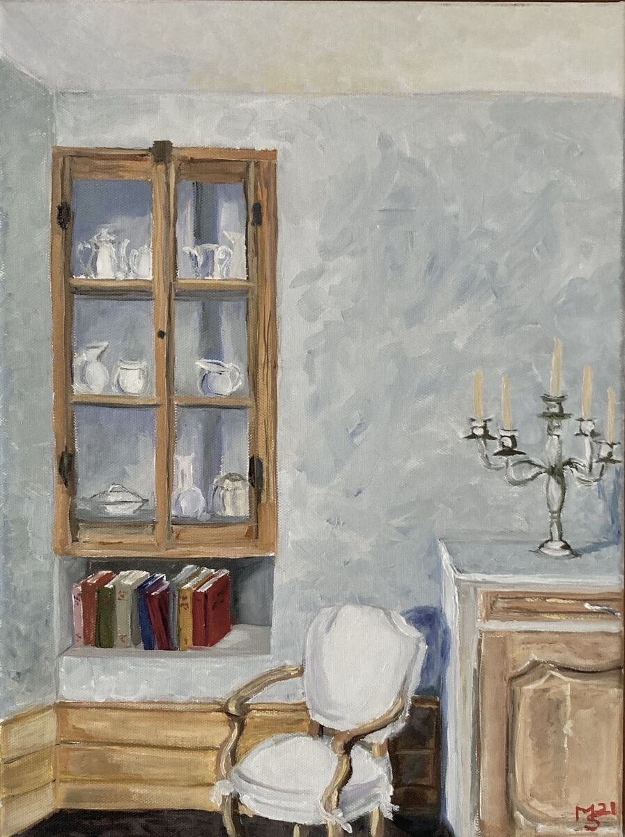 This interior is in a quiet corner in a typical 18th century home in the French countryside. It is in a quaint village in the wine region of Chablis. The room, was furnished from a bygone era reflecting French provincial life. I felt at peace here and wanted to replicate that feeling in my painting. The villagers were outside gathering for the annual Fete de Pomme in the square. A community sharing their local produce and having a wonderful time. I love how a painting can evoke a memory for one person and give visual pleasure to another. It is framed in a natural coloured box frame