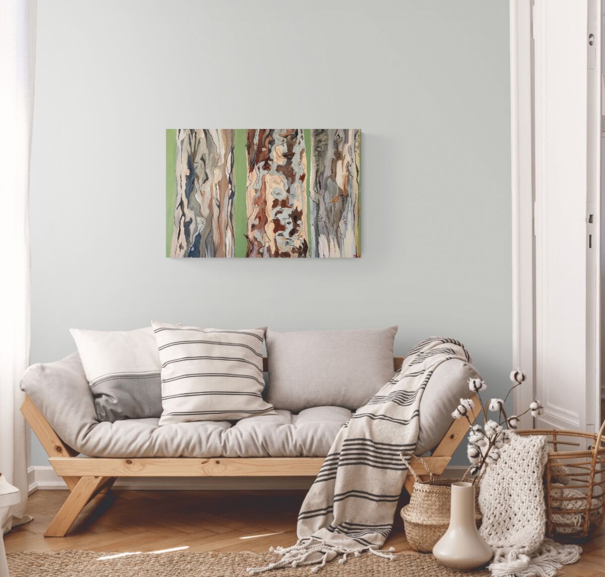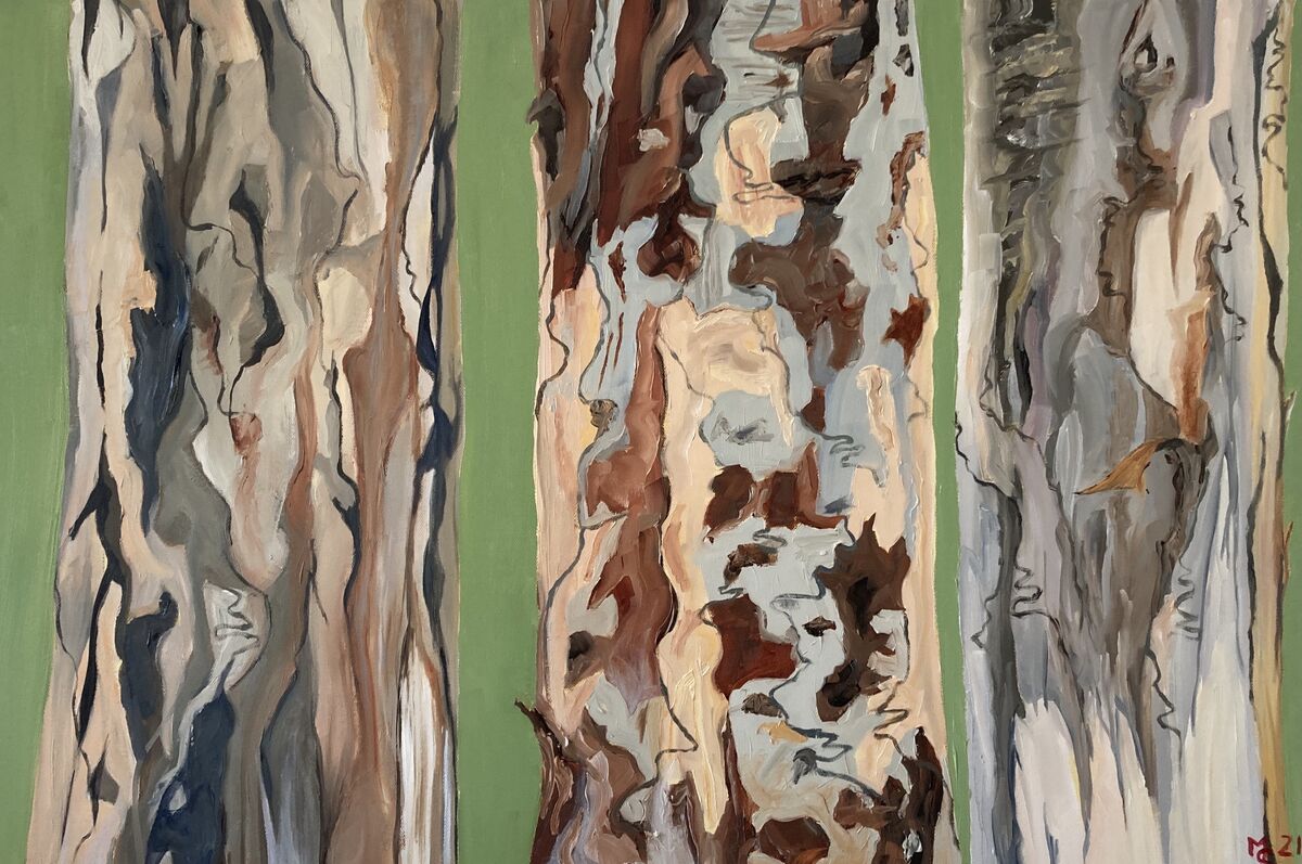 This is the 3rd painting I have done in the Angophora series, (previous 2 in private collection). These trees are so fascinating as they strip their old bark to reveal beautiful shapes and colours on their trunk in Springtime. I loved layering and manipulating the oil paint to represent these magnificent tree trunks and each tree has its own distinctive appearance. Mother Nature at her best. I am drawn to these earthy colours in our Australian bush.