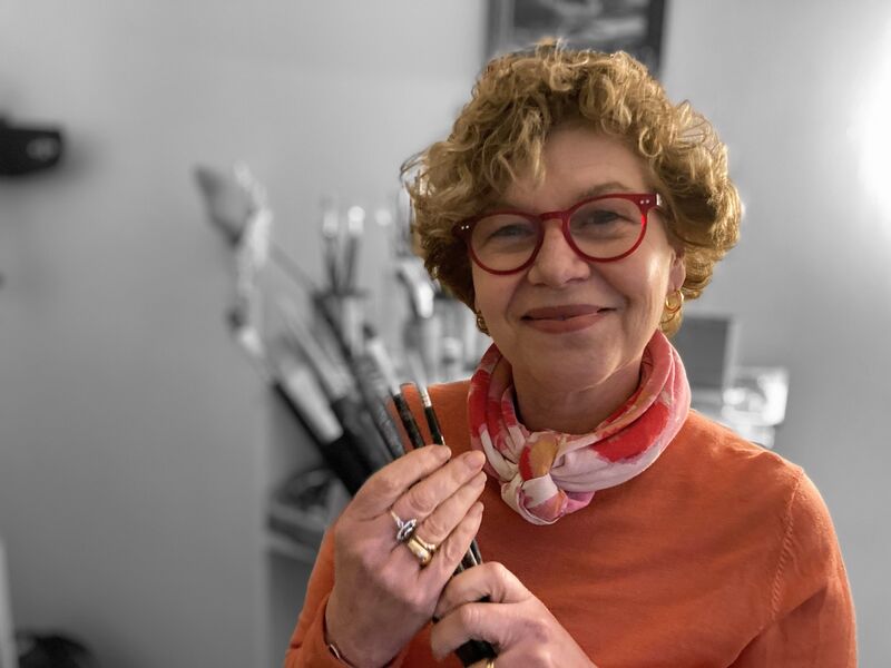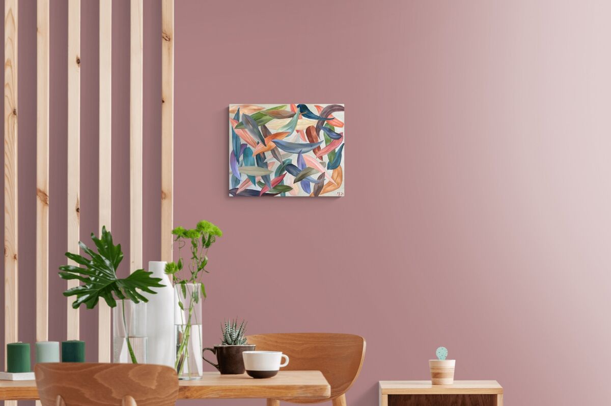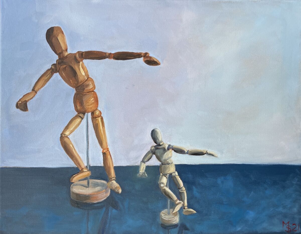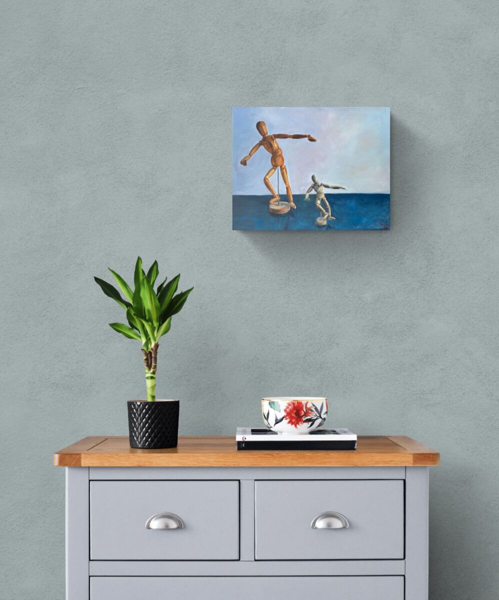 Someone in my household fiddled with the poses of my artist mannequins and here they are. I love how the small mannequin seems to be telling the big one to”follow me”. The little guy can take the lead and we should take notice! This painting could be hung anywhere in the home and also suitable for an office area. The neutral colours of the artwork should blend well with most decor.