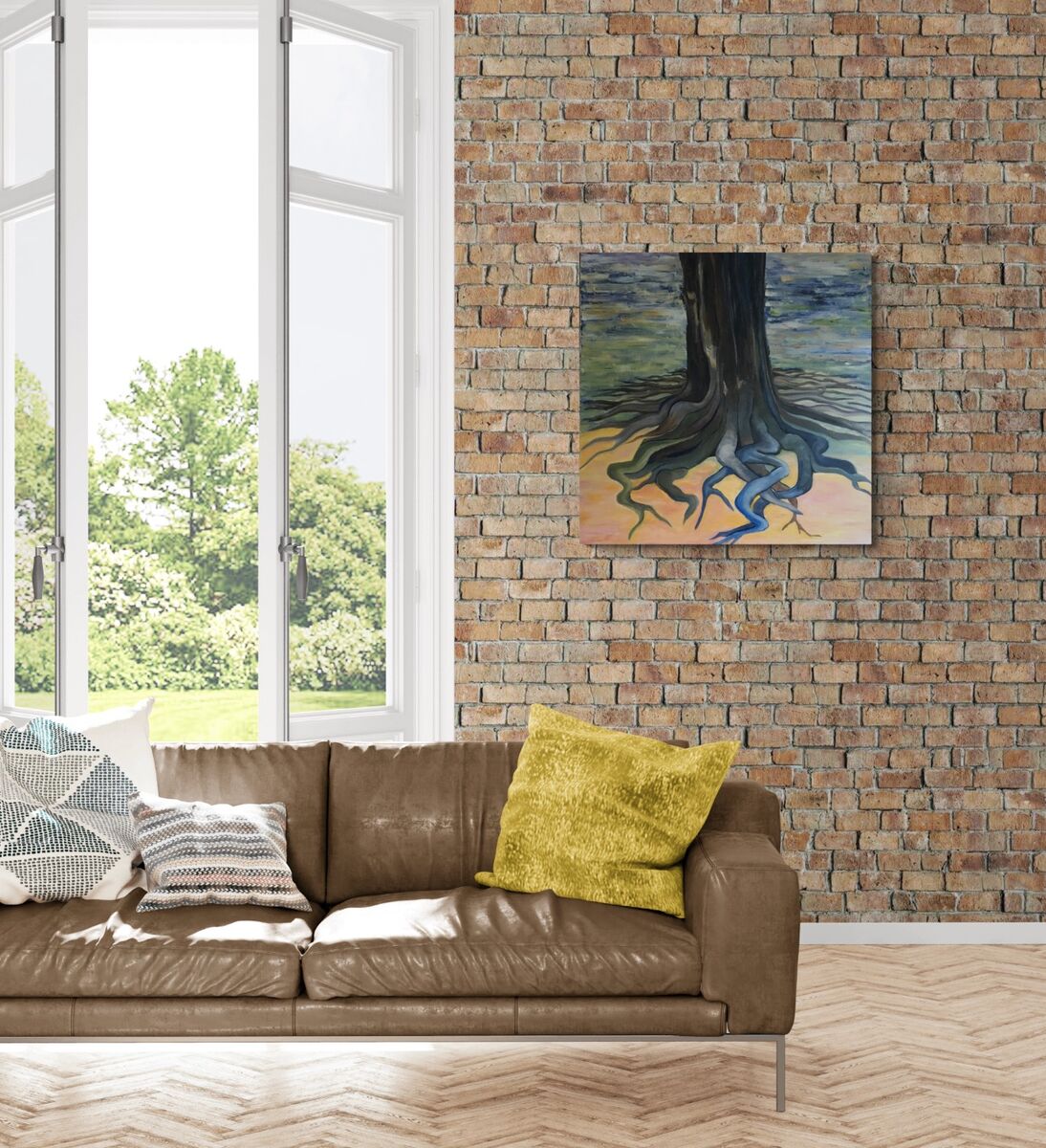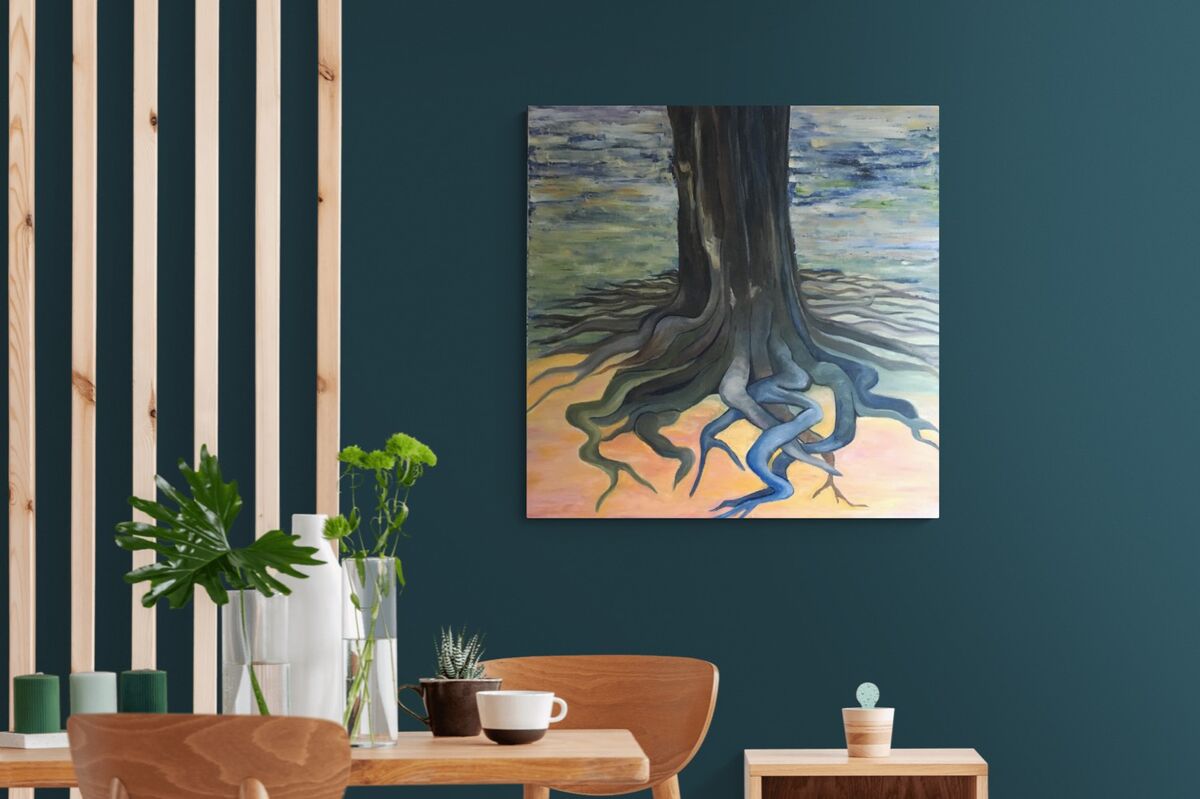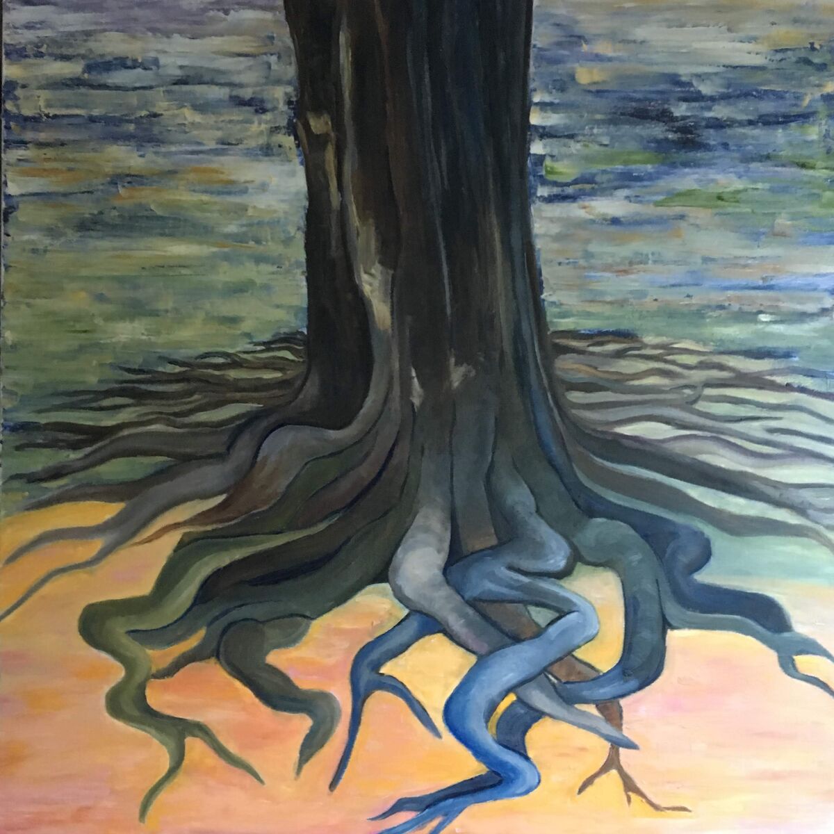 While standing at a well at a temple in Tokyo, this ancient tree provided shade for all. It was the magnificent root system that caught my eye. How long had this tree stood here for? How incredibly intricate and beautiful it was, staying strong and steadfast for probably centuries. This is quite a large piece and could sit as a feature on a wall. I used a palette knife to build up the colour in the background.